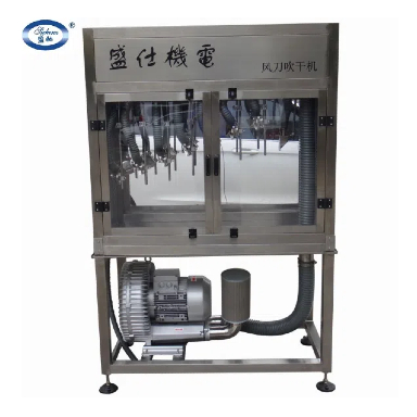 答:1、針對貼標前的干燥要求進行設計,采用專利設計風刀,把高速風引致玻璃瓶表面,快速切除水份,以更低功率(高壓鼓風機配合風刀—···